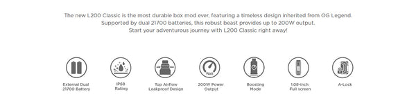 طقم جيك فيب L200 كلاسيك 200 واط، يتميز بمدى خرج يتراوح بين 5 و200 واط، ومزود بخزان Z MAX، ويستخدم بطاريتين 21700. صُنع هيكل جيك فيب L200 كلاسيك من سبائك الزنك المتينة، ويجمع جميع الميزات المحبوبة لجهازي L200 وAegis Legend السابقين في هيكل جديد يتسع لبطاريتين 21700، مما يزيد من عمر جلسات التبخير. بالإضافة إلى ذلك، يدعم طقم جيك فيب L200 كلاسيك بطاريات 18650 باستخدام أكمام محول البطارية المرفقة. يتميز بوحدة تحكم في درجة الحرارة وتوافق واسع مع خيارات أسلاك النيكل والتيتانيوم والفولاذ المقاوم للصدأ.