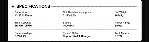 طقم Lost Vape Centaurus B60 AIO، الذي يوفر نطاقًا من 5 إلى 60 واط، وشريحة Quest 2.0، وجهاز UB Ultra Coil المتوافق مع UB AIO Pod لإنتاج البخار. مصنوع من الفولاذ المقاوم للصدأ المتين وسبائك الزنك، يُعد طقم Centaurus B60 AIO النسخة الأصغر من طقم B80 AIO Boro. مزود ببطارية مدمجة بسعة 1600 مللي أمبير/ساعة، نطاق إنتاج 5 إلى 60 واط مثالي لمن يرغبون في استخدام ملفات UB Ultra Coils. مع جهاز UB AIO Pod، يُقدم جهاز Centaurus B60 بخارًا غنيًا ونكهة غنية من سائلك الإلكتروني أو أملاح النيكوتين المفضلة.