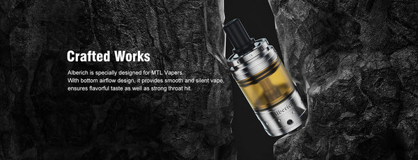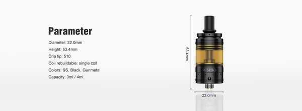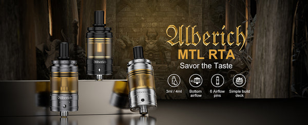 صُمم جهاز Alberich MTL RTA بقطر 22 مم خصيصًا لمستخدمي MTL. بفضل تصميم تدفق الهواء السفلي، يمنحك مذاقًا لذيذًا وشعورًا قويًا بالحلق. يحتوي على 6 دبابيس لتدفق الهواء لتحسين تجربة البخار: 0.8 مم، 1.0 مم، 1.3 مم، 1.6 مم، 2.0 مم، 2.5 مم. تصميم البراغي الأربعة وفتحة القطن المُحسّنة يُسهّلان عملية بناء الملف. كما يتميز Alberich MTL RTA بأنبوب PEI سعة 3 مل/4 مل وأنبوب زجاجي (يُباع الأنبوب الزجاجي 3 مل/4 مل بشكل منفصل، بينما يُرفق أنبوب PEI سعة 3 مل/4 مل) ونظام تعبئة علوي سهل.