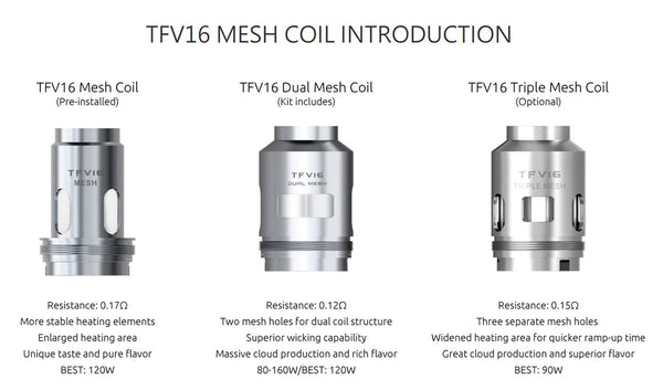 The Smok TFV16 Replacement Coil has three Coil types for you to choose. They are Mesh Coil 0.17ohm, Dual Mesh Coil 0.12ohm, Triple Mesh Coil 0.15ohm. The TFV16 Replacement Coil...