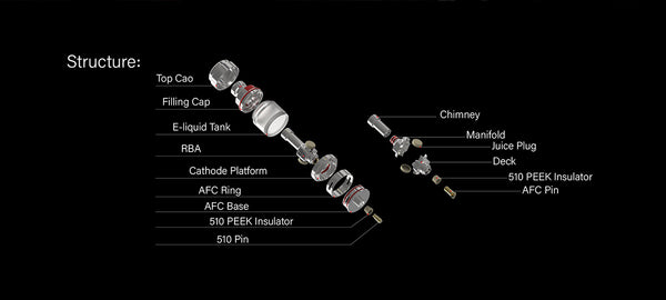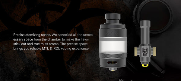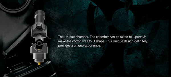 The design concept of the Hazard RTA is derived from Bio Hazard gas masks with the bridge design looking similar to side filters. Along with the cool appearance, you'll find this latest RTA playful and be amazed by its adaptability. As an RTA tank, the Hazard produces great flavors & can be utilized in two ways.