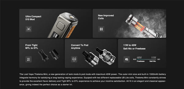 The Lost Vape Thelema Mini 45W Kit, a new generation of tank mods & pod mods with maximum 45W power. The cuter-mini size and built-in 1500mAh battery integrate harmony for...