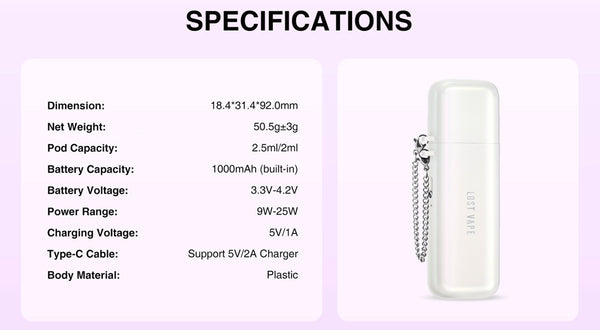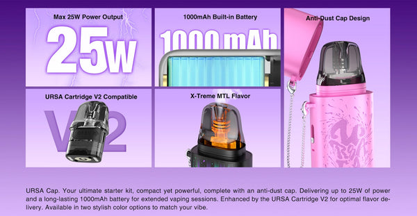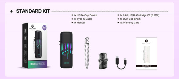 Lost Vape Ursa Cap comes with 2.5ml vape juice volume, a 1000mAh rechargeable battery as the power source, and a unique anti-dust cap for carefree vaping. Lost Vape Ursa is incredibly compact, as large as a lipstick. What's more, the cartridge's built-in 0.8 ohm resistance ensures dense, flavorful vapor. It can hold 2.5ml e-juice thanks to the Ursa Pod Cartridge V2. There is an indicator light that displays battery status with different colors. The special dustproof cap is also equipped with a chain so that you will not lose it. Lost Vape Ursa Cap offers best MTL vaping experience with 25W max output.