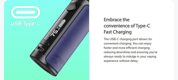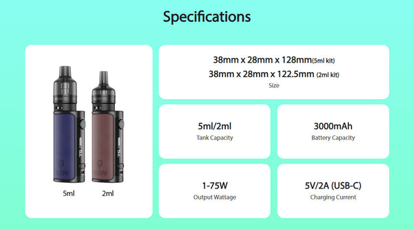 Eleaf iStick i75 Kit with stylish leather exterior is luxurious and comfortable to hold. It is composed of iStick i75 Device and EP Pod Tank 5ml. It is powered by a built-in 3000mAh battery with 75W max to bring you long-lasting vaping experience. Its OLED screen allows you to switch between VV (Variable Voltage) and VW (Variable Wattage) modes, granting you control over wattage levels from 1-75W and voltage from 0.5-9V. The EP Tank, with dual-side airflow control, offers a wide range of vaping experiences, from tight MTL to DL. This kit features a luxurious leather and metal construction, complete with a side-mounted round fire button for added convenience and comfort. With USB Type-C charging, it ensures a long-lasting vaping experience and supports EP Series Coils for rich clouds and enhanced flavo. Experience personalized vaping with the optional UI interface on this premium kit.