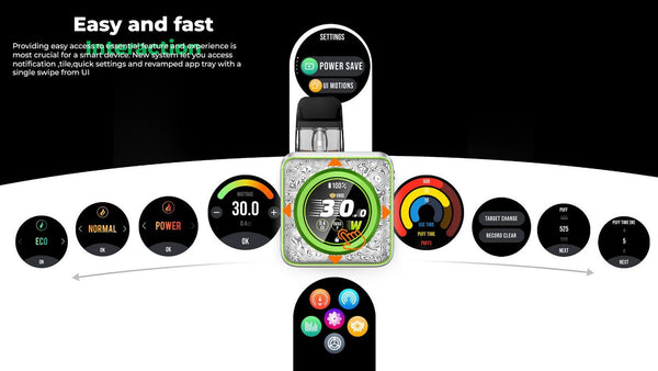 Weighing only 22 grams, this device combines elegant minimalism with enhanced usability. Its 1.09-inch precision touchscreen provides a seamless user interface, giving access to quick settings, notifications, and over 29 customizable UI themes for a personalized vaping experience. The upgraded screen frame ensures better durability and impact resistance, while the clean layout offers intuitive control with a single swipe.
