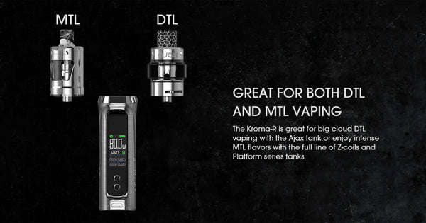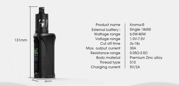 The Innokin Kroma R Zlide Kit is a powerful and compact vape mod device that consists of an Innokin Kroma R Mod and an Innokin Zlide Tank. Powered by single 18650 batteries(not included), Kroma R has 80W high power, which can definitely satisfy the vapor chaser. In addition, the Kroma R Mod uses Innokin's proprietary chip with the most diverse features and all the most popular working modes. Enjoy great vaping with Wattage (6-80W) and Voltage (1-7.5V) outputs and Soft, Normal and Boost Modes. All important information is clearly displayed on the bright OLED screen including battery charge, wattage/voltage, coil resistance, puff count, voltage out and wattage lock. The Kroma-R features 2A MicroUSB quick charge and integrated safety protections. As for the Innokin Zlide Tank, it features 4mL e-juice capacity and features a convenient retractable top-fill design that is secured by a dripper locking system. Moreover, the Kroma-R is great for big cloud DTL vaping with the Ajax tank or enjoy intense MTL flavors with the full line of Z-coils and Platform series tanks.