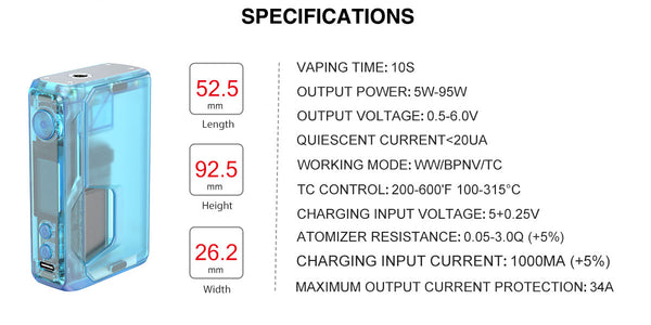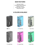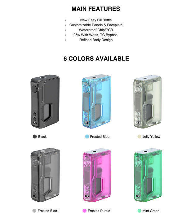 The Vandy Vape Pulse 3 Box Mod, offering a 5-95W output range, TC mode, and utilizes a soft touch squonk bottles to deliver eJuice to bottom-fed RDAs. features easy fill bottle, and waterproof chip/PCB. The panel is replaceable, Pulse V3 Mod supports 21700 battery, and 18650 battery with 18650 adapter.Equipped with a waterproof chip, the Pulse 3 has much potential, delivering power from the single battery in wattage, temperature control, or bypass mode to allow novice or advanced vapers excel with their preferred atomizers.